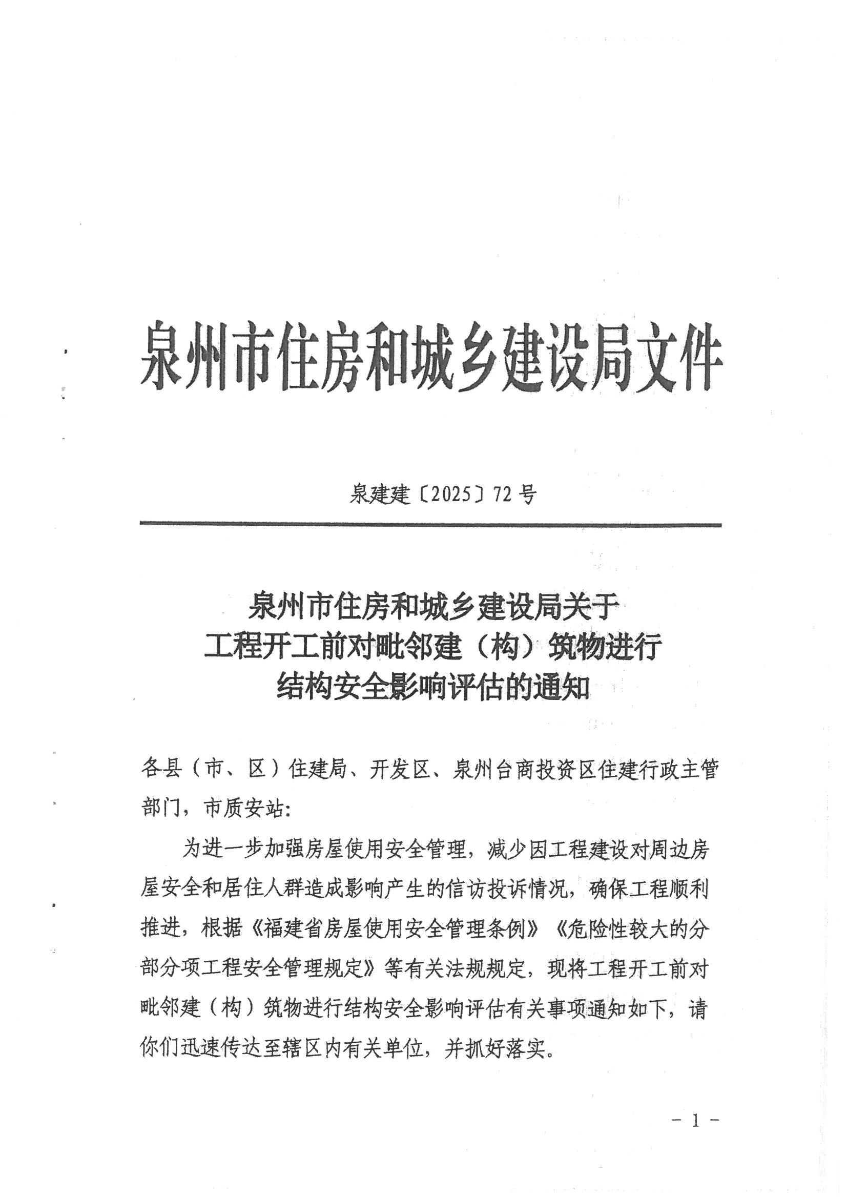 为进一步加强房屋使用安全管理,减少因工程建设对周边房屋安全和居住人群造成影响产生的信访投诉情况,确保工程顺利推进,现将《泉州市住房和城乡建设局关于工程开工前对毗邻建(构)筑物进行结构安全影响评估的通知》(泉建建〔2025〕72号)转发给你们,请按照文件要求做好落实。
