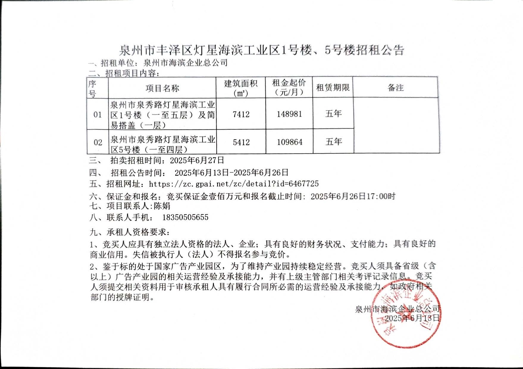 泉州市丰泽区灯星海滨工业区1号楼、5号楼招租公告
