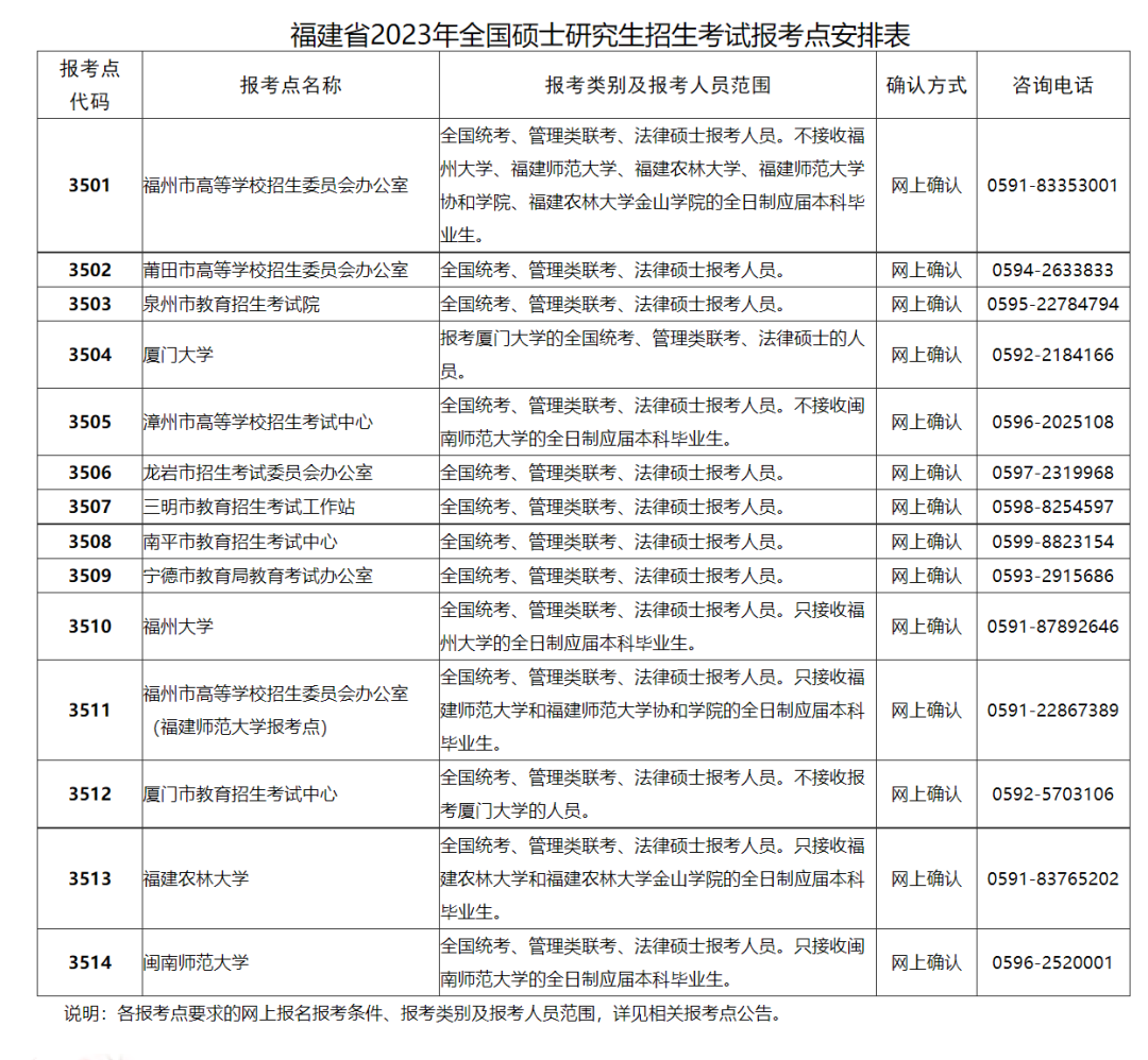 我省报考点全部采用网上确认方式,共设福州市高等学校招生委员会办公室、莆田市高等学校招生委员会办公室、泉州市教育招生考试院、厦门大学、漳州市高等学校招生考试中心、龙岩市招生考试委员会办公室、三明市教育招生考试工作站、南平市教育招生考试中心、宁德市教育局教育考试办公室、福州大学、福州市高等学校招生委员会办公室(福建师范大学)、厦门市教育招生考试中心、福建农林大学和闽南师范大学等14个报考点。考生报考类别及范围详见《福建省2023年全国硕士研究生招生考试报考点安排表》。