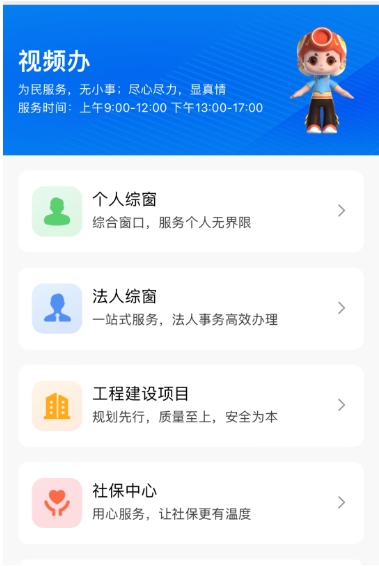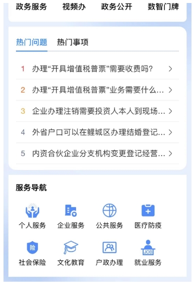 其中,“政务服务”板块对接省网上办事大厅,涵盖个人服务、企业服务、公共服务等8个服务模块;“视频办”板块设置个人综窗、法人综窗、社保中心、医保中心、工程建设项目、招商项目“帮代办”6类客服人员,通过“人工客服+视频通话”的方式,提供业务咨询、同屏指导、在线帮办等服务;“政务公开”板块集纳区“政策文件库”数据,可便捷查询相关政策内容;“数智门牌”板块涵盖146项高频事项分类,能为用户提供沉浸式、情景式“一件事一次办”服务。