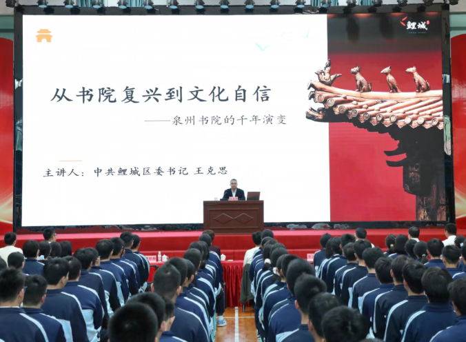 12月24日下午,区委书记王克思走进泉州市第六中学,以“从书院复兴到文化自信——泉州书院的千年演变”为主题,为师生带来一堂内涵丰富、启迪思想的思政课。区领导赵伟、张剑辉参加。