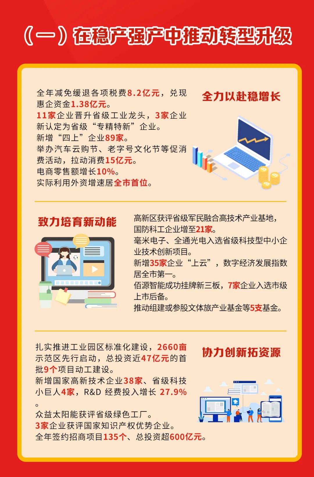 兑现落实、优化调整一批加快经济发展的新政策新措施,新培育“四上”企业超百家。突出“强二优三”,做大做强纺织鞋服、电子信息、机械汽配等制造业,做活做优商贸服务、数字文创、文化旅游、电子商务等现代服务业。支持消费企业加快复苏,再培育1个智慧商圈、1个综合电商园、1个垂直电商园;联合侨力量推动企业出海拓市场。