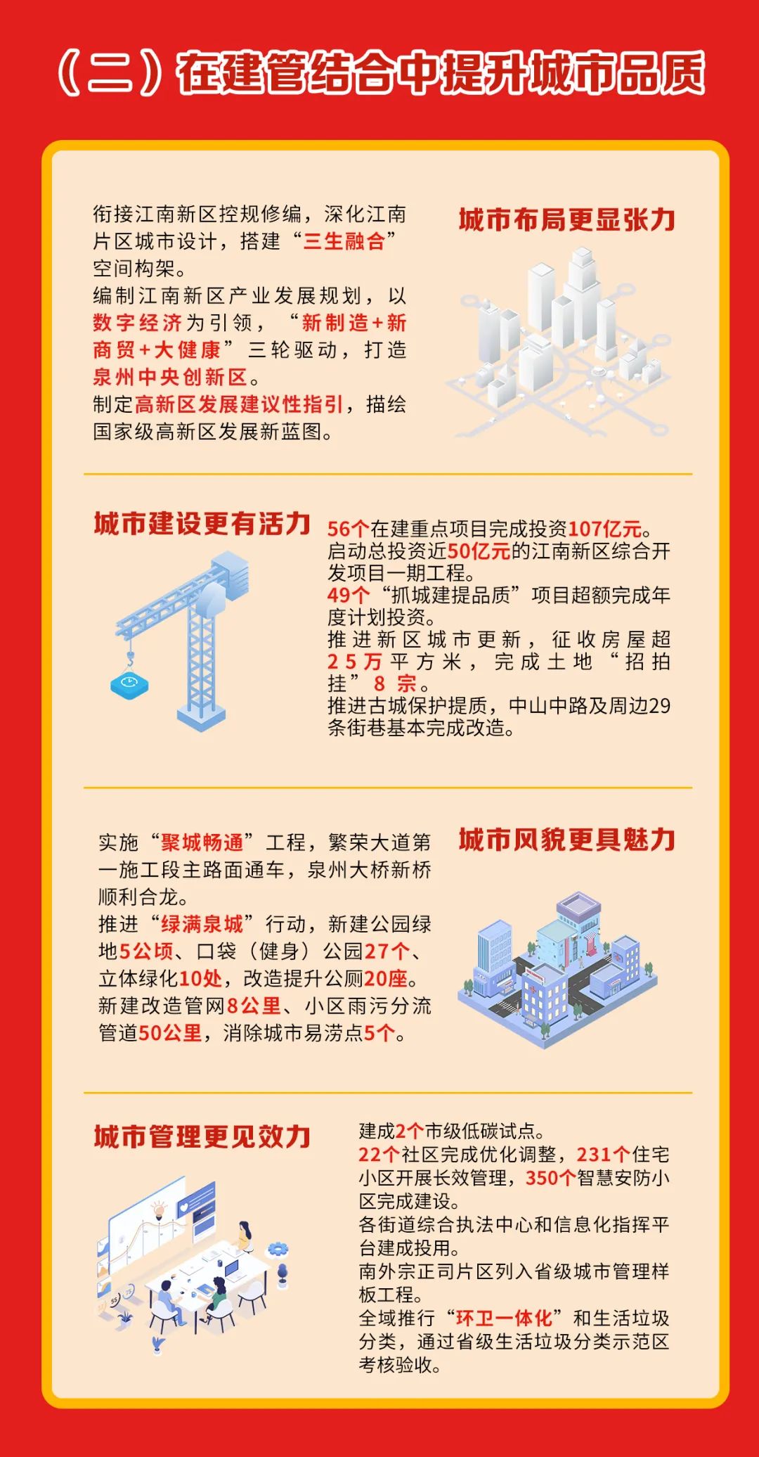 集聚头部资源高标准开发繁荣、站前西、金鲤等3大片区,力促16宗地块出让,加快10个商住项目建设,打造江南新区都市核心区。加快启动泉州演艺剧场综合体等文商旅项目,有效承接古城文旅功能外溢。实施“聚城畅通”行动,加速推进繁荣大道等3条主干道、金鲤大桥等2个跨江通道建设,启动泉南高速新增葡京互通及接线工程。补齐公共配套设施短板,建设变电站、大型垃圾转运站,加快5G基站布局。