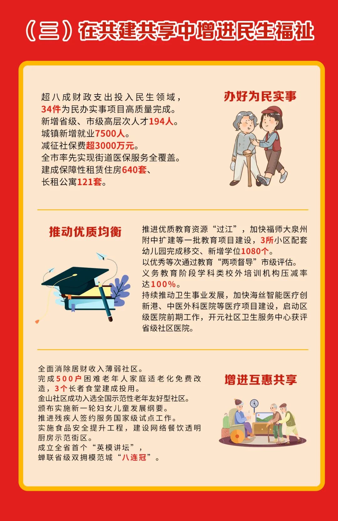 高质量办好31项为民办实事项目。建立辖区全民参保计划库,争取医保参保覆盖率达96%。建设保障性租赁住房1500套、人才公寓60套。建设五星级养老服务照料中心,新建或改扩建长者食堂3个。深化实施新时代山海协作,扎实推进对口帮扶。持续推进退役军人服务保障体系建设。