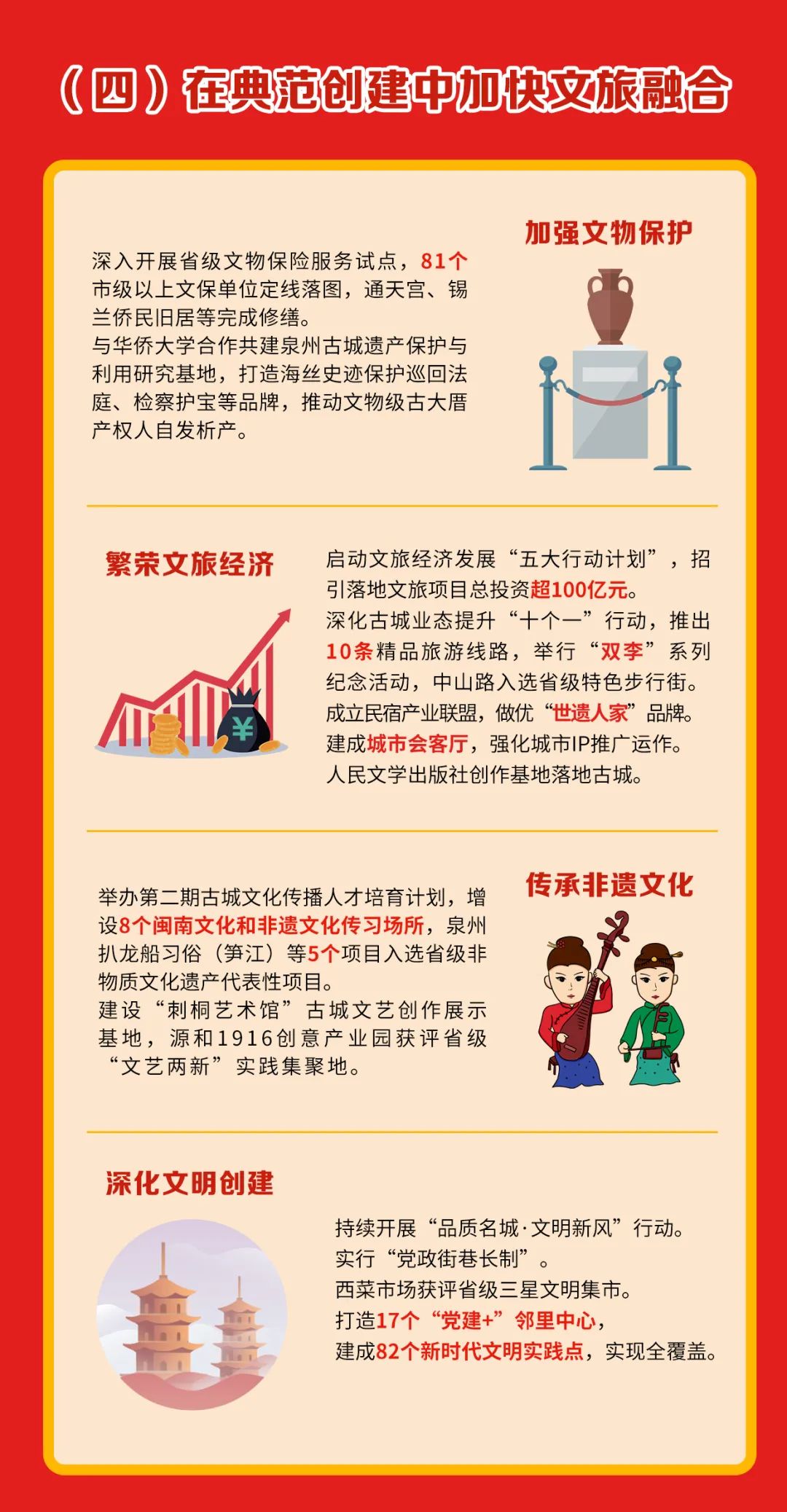 按照世界古城活态传承典范定位,加快打造大泉州旅游集散平台、国家5A级旅游景区。开展文旅经济大提速大发展活动年,编制古城产业发展规划,出台“1+1+N”政策,加快30 个文旅重点项目建设。常态化举办海丝泉州数字文创博览会。高质量办好百年中山路庆典、申遗成功两周年等系列活动,推动影视文旅、数字文旅发展,建设新华侨大厦等10个住宿载体,建设龙头山等旅游集散中心,力促旅游总收入突破80亿元、增长15%。