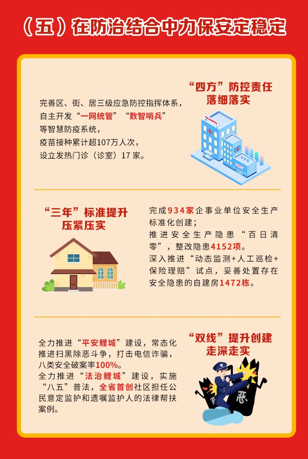 提升财政保障能力和预算管理水平,完善国企投融资监管机制。常态化开展扫黑除恶斗争,持续打击电信诈骗和养老诈骗。进一步深化党建引领基层网格管理服务。优化打造82个“提高型”智慧安防小区。