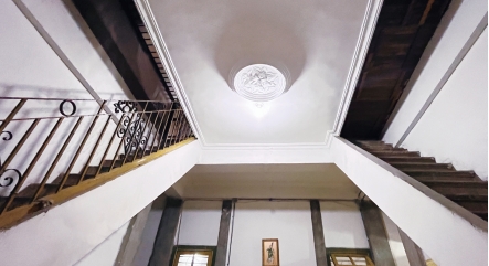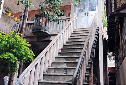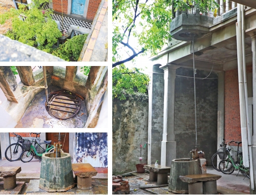 为方便居住,洋楼内外均设有楼梯,除一楼大厅楼梯可以直上二楼外,一楼大门西侧还有一座石梯通往二楼,石质扶手和阶梯的线条简约大方,赏心悦目。二楼两侧外廊各有一处向楼外凸出的小阳台,大门东侧小阳台有一圆孔,从上往下看,正好对应一楼院中的一口水井,当年叶家人在二楼即可直接从阳台吊水上楼,免去了拎水爬梯之苦,可见主人思虑周全。