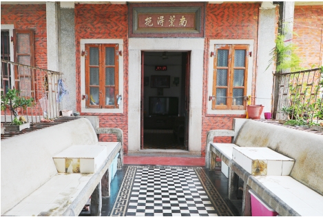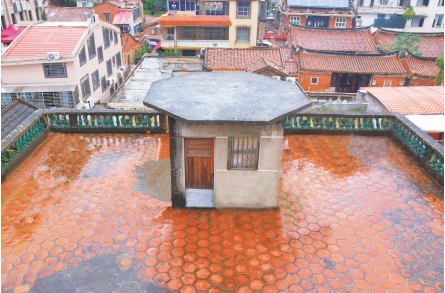 洋楼分主后楼,主楼建成10年后才建的后楼,两栋楼以天桥相连,地上铺设着当年从印尼海运来的黑白瓷砖,加上颇有地中海风的蓝色门窗、闽南风的烟炙砖,中外建筑元素混搭,却丝毫不见造作,反而搭配得熨帖自然。天桥上还砌筑了石质长条靠椅,是绝佳的纳凉场所。