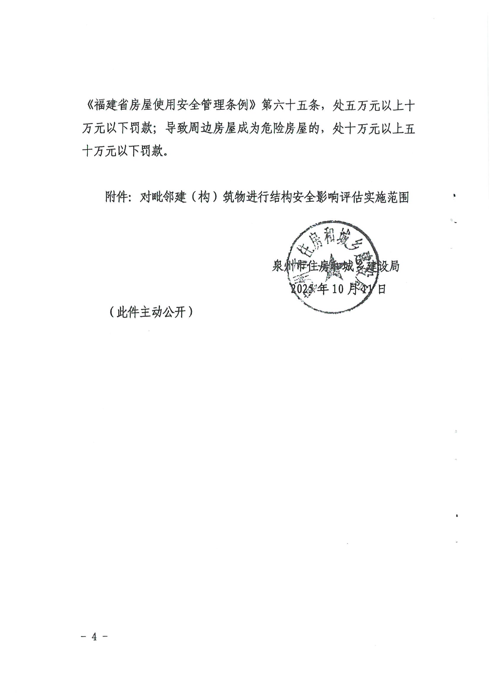 为进一步加强房屋使用安全管理,减少因工程建设对周边房屋安全和居住人群造成影响产生的信访投诉情况,确保工程顺利推进,现将《泉州市住房和城乡建设局关于工程开工前对毗邻建(构)筑物进行结构安全影响评估的通知》(泉建建〔2025〕72号)转发给你们,请按照文件要求做好落实。