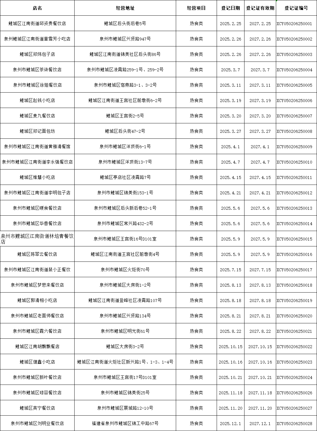 江南街道2025年小餐饮登记证办理名单