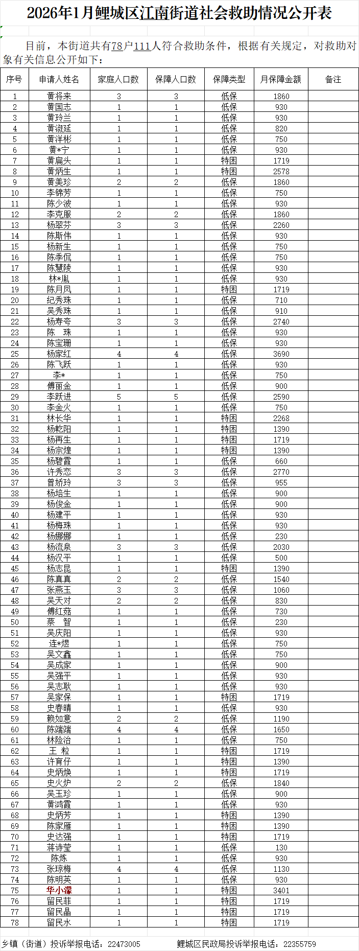 2026年1月葡京娱乐场 江南街道社会救助情况公开表