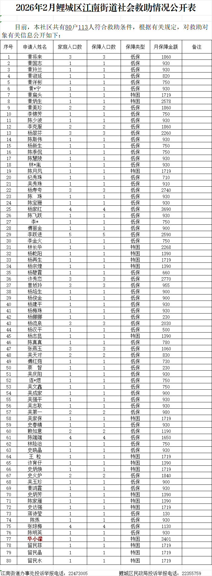 2026年2月葡京娱乐场 江南街道社会救助情况公开表