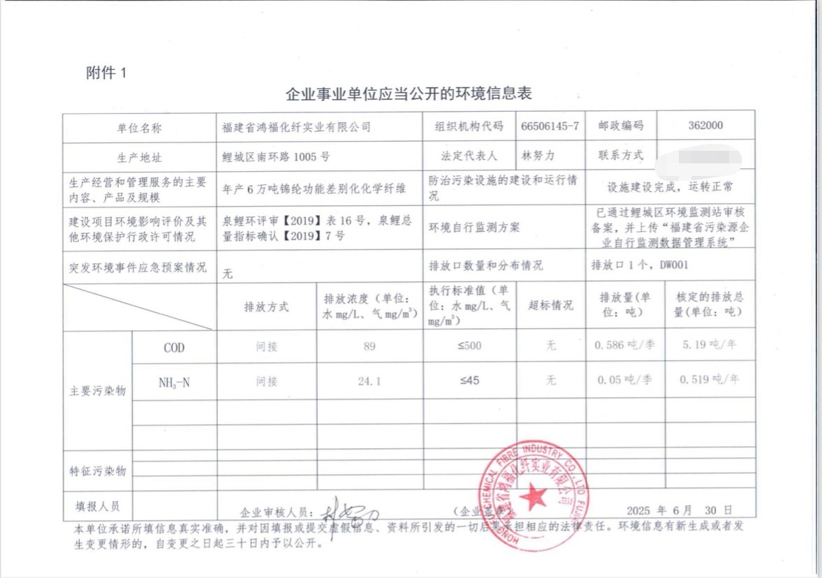 福建省鸿福化纤实业有限公司2025年第2季度环境信息公开表