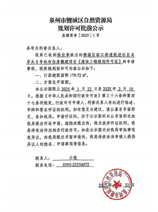 [规划许可]葡京娱乐场 临江街道跃进社区乌岸头8号私有住房翻建项目《建设工程规划许可证》批前公示