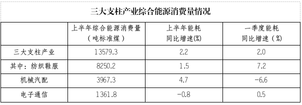 分行业看,上半年全区规模以上工业三大支柱产业合计综合能源消费量达13579.3吨标准煤,能源消费量同比增长2.2%。其中,纺织鞋服能耗占全区比重达47.3%,能源消费量同比增长1.5%,增速较一季度放缓5.7个百分点;机械汽配能源消费量同比增长4.7%,增速较一季度扩大11.3个百分点;电子通信能源消费量同比降低0.8%。六大重点耗能行业合计能耗同比增长0.3%,增幅较一季度下滑0.8个百分点。