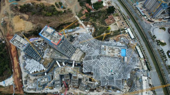 作为省级重点项目,“海丝号”综合体项目自开工以来,始终以“起步即冲刺”的姿态全力推进。目前,项目所有主体结构已完成封顶,全面转入幕墙、钢结构、机电及室内装修施工。项目总体建设进度过半,关键节点正提速攻坚。